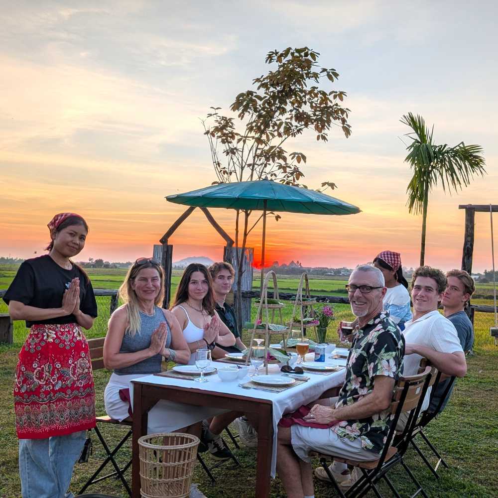 Then comes something special: Baitang countryside sunset. Open-air dining overlooking rice paddies with traditional Cambodian BBQ. The sunset over rural Cambodia… it’s the kind of moment you can’t plan, can’t rush, can’t force. It just happens when you give it time and space.