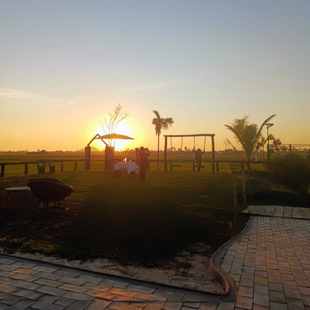 As the day starts to cool, we leave the city behind and travel to the peaceful countryside of Baitang. Here, rice paddies stretch out in every direction, their green stalks swaying gently in the breeze. Farmers finish their day’s work as the sun begins its descent, painting the sky in shades of orange, pink, and gold. Watch the light change across the fields and feel the quiet rhythm of rural Cambodia. This is the perfect time to take photos and simply breathe in the tranquil atmosphere.