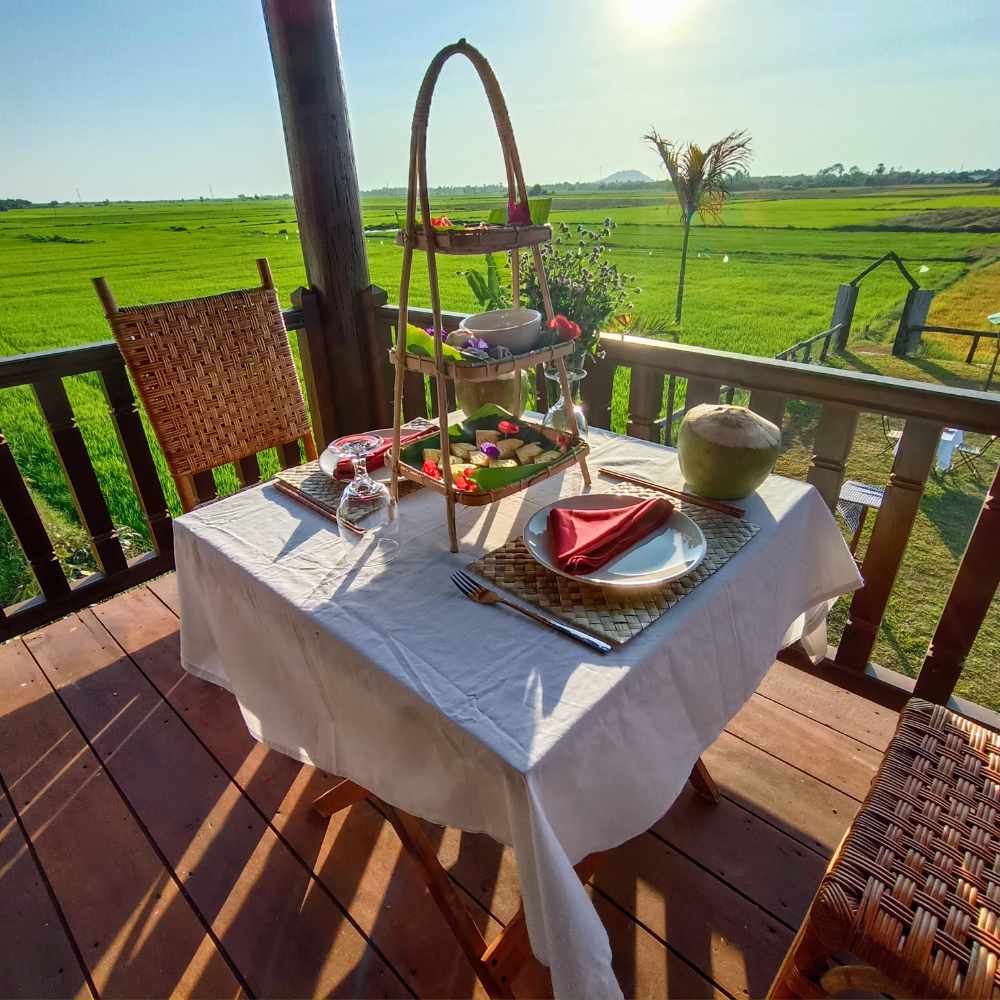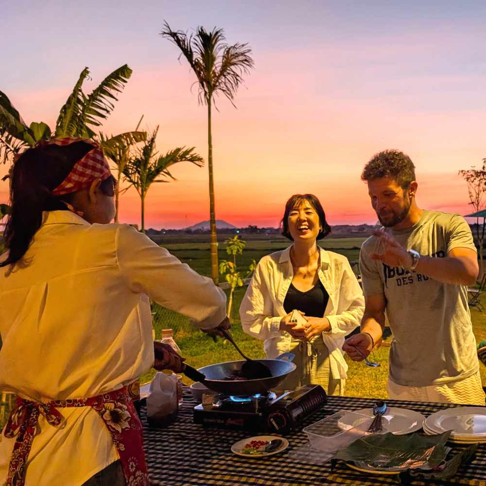 Tables wait outside with white cloths and place settings. You sit down to eat everything you just created. The sun peaks, making the rice fields glow. A breeze comes through. Somewhere nearby, a farmer calls to his buffalo. You’re eating traditional dishes in the exact place they originated, cooked with techniques unchanged for centuries.