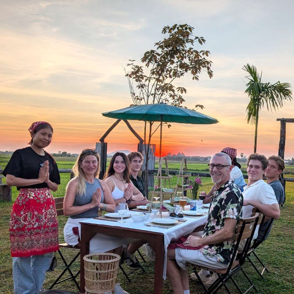 5:45 PM: The grand finale. We take you to a stunning spot at Baitang Siem Reap. You sit by the rice fields sunset view, sip a cold drink, eat some fresh local fruit, and watch the day end in a blaze of color.